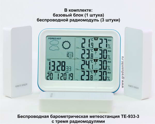 Цифровая беспроводная барометрическая метеостанция ТЕ-933-3 с тремя беспроводными радиомодулями имеет ЖК-дисплей и служит для одновременного отображения: атмосферного давления (оно одинаковое и на улице, и в помещении), температуры и относительной влажности в комнате (встроенные в базовый блок сенсоры температуры и относительной влажности), температуры и относительной влажности в трёх разных местах (встроенные в радиомодули сенсоры температуры и относительной влажности). На основе полученных данных о давлении, температуре и влажности, а также их изменения, метеостанция формирует прогноз погоды на ближайшее время. Кроме этого, метеостанция ТЕ-933-3 имеет: часы, будильник, календарь. Отличительная особенность данной модели - наличие сразу 3 независимых радиомодулей, показания которых одновременно отображаются на дисплее базового блока.